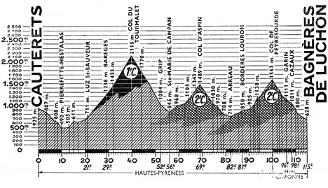 12h30 (Hautes-Pyrénées) : Cauterets (km 0) - Pierrefitte-Nestalas (km 10) - N21 Luz-St-Sauveur (km 21) - Barèges (km 29) - Col du Tourmalet (km 40-GPM1) - Gripp (km 52) - Ste-Marie-de-Campan (km 56) - N618 col d'Aspin (km 62-GPM2) - Arreau (km 82-ravitaillement) - Bordères-Louron (km 87) - Col de Peyresourde (km 100-GPM2) - (Haute-Garonne) : Garin (km 106) - Cazaux (km 108) - Luchon / Allée d'Étigny (km 115).