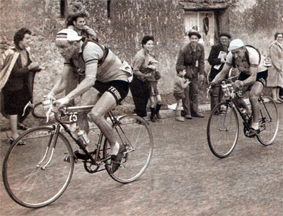 Hilaire Couvreur a déclenché l'échappée du jour à Valentine au km 40. Pontet est le premier à le rejoindre mais équipier du maillot jaune Robic, il ne le relaie pas