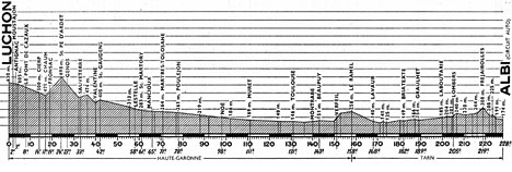 9h30 (Haute-Garonne) : Luchon (km 0) - Moustajon (km 2) - Antignac (km 3) - Le Pont-de-Cazaux (km 8) - Cierp (km 14) - Chaum (km 17) - Fronsac (km 19) - Saint-Pé-d'Ardet (km 24) - Genos (km 27) - Sauveterre (km 33) - Valentine (km 40) - Saint-Gaudens (km 42) - N117 Lestelle (km 58) - Saint-Martory (km 61) - N125 Mancioux (km 65) - Martres-Tolosane (km 71) - Poulejon (km 78) - Noé (km 98) - Muret (km 111) - Toulouse (km 131-ravitaillement) - N 112 Montrabe (km 140) - Beaupuy (km 143) - Verfeil (km 151) - (Tarn) : Le Ramel (km 158) - Lavaur (km 168) - N631 Briatexte (km 182) - Graulhet (km 189) - Laboutarié (km 200) - N631-D41 (km 202) - D41 Lombers (km 205) - D81 Fréjairolles (km 219) - Carr. D81-D69 (km 223) - Albi / circ. automobile (km 228).