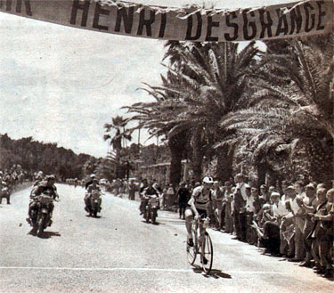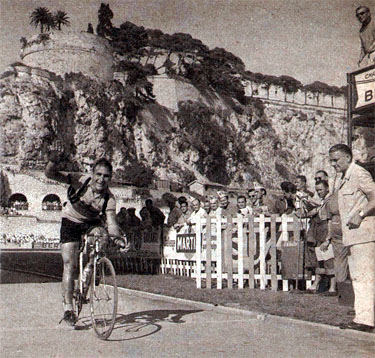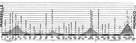 - A la sortie de Nice, dès le pied du col d'Eze, Joseph Mirando part au sprint et décroche successivement Lorono puis Molinéris et Van Genechten. Lorono revient ensuite avec facilité ce qui stoppe les efforts de Mirando. Van Genechten et Molinéris reviennent également. Le quintette est reconstitué. Derrière, c'est Géminiani qui attaque en emmenant Bobet puis Lauredi, Malléjac et Astrua mais sous l'impulsion de Bauvin, un egroupement a lieu à mi-col. Bobet repart de plus belle et seuls Astrua et Schaer répondent. A l'énergie le maillot jaune Malléjac et Masip reviennent. Au sommet (km 225), Mirando passe en tête devant Van Genechten et le reste des échappés, Schaer devant Masip, Bobet, Astrua et Malléjac passent à 3'25", à 4'15" le peloton emmené par Bartali.