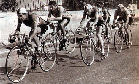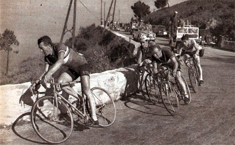 Derrière, dans le col d'Eze, Bobet secoue le peloton et le maillot jaune (dernier du groupe) s'accroche difficilement