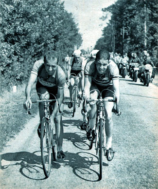 La bonne échappée file vers Le Mans. A gauche Lucien Lazaridès enlève les graviers de son boyau, à droite le futur vainqueur Martin Van Geneugden