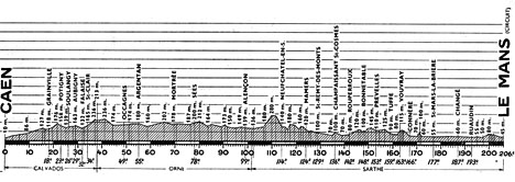 10h45 (Calvados) : Caen (km 0) - Grainville (km 18) - Potigny (km 23) - Soulangy (km 26) - Saint-Pierre-Canivet (km 28) - Aubigny (km 29) - Falaise (km 32) - Saint-Clair (km 34) - (Orne) : Pierrefiite (km 44) - Occagnes (km 49) - Argentan (km 55) - Mortrée (km 70) - Sées (km 78) - Ving-Hanaps (km 90) - Alençon (km 99) - (Sarthe) : Neufchâtel-en-Saosnois (km 114) - Mamers (km 124-ravitaillement) - Saint-Rémy-des-Monts (km 129) - Champaissant-St-Cosmes (km 136) - Roupeyroux (km 142) - Bonnétable (km 148) - Aulaines (km 150) - Prévelles (km 153) - Tuffé (km 158) - Vouvray (km 161) - Le Pressoir (km 163) - Conneré (km 167) - Saint-Mars-la-Brière (km 177) - Changé (km 187) - Ruaudin (km 193) - Belle-Œuvre / entrée circuit automobile (km 195) - Le Mans / circuit automobile (km 206).