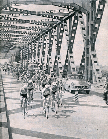 Le Tour 1954 est parti, le peloton passe sur un pont près de Haarlem.