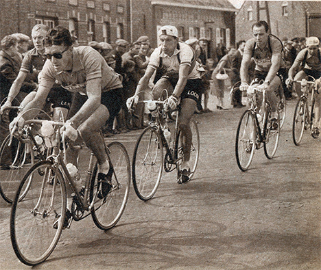 Louison Bobet emmène l'échappée de luxe. Derrière lui, Darrigade et Voorting puis Koblet.