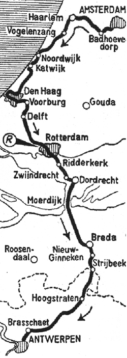 11h25 (HOLLANDE) : Amsterdam/Autostrade E (km 0) - Badhoevedorp (km 6) - Nieuwerkerk (km 8) - Haarlem (km 18-CV) - Noordschalkwijk (km 21) - Vogelanzang (km 26) - Noordwijkerkout (km 36) - Leewenhorst (km 41) - Noordwijk-Aan-Zee (km 43) - Noordwijk-Binnen (km 45) - Wassenaar (km km 61) - Oudwassenaar (km 65) - Marlot (km 67) - Schweveningen (km 74) - La Haye (km 82) - Voorburg-Rijswijk (km 86) - Delft (km 92) - Overaschie (km 102) - Rotterdam/Nord Tunnel (km 107-ravitaillement) - Rotterdam/Carr. Sud-Est (km 113) - Carref. Sud-Dordrecht (km 129) - Carr. Nd-Zevenbergergschenheek (km 143) - Carr. Ouest-Princenhage (km 156) - Breda (km 160-CV) - Ginneken (km 163) - Ulvenhout (km 165) - Strybeek (km 172) - (BELGIQUE) : Meerle (km 175) - Hoogstraten (km 184) - Saint-Lenaarts (km 193) - Brecht (km 196) - Sterhoven (km 198) - Carr. près St-Job (km 203) - Maria-Ter-Heide (km 207) - entrée du circuit (km 212) - Brasschaat (km 216).
