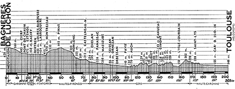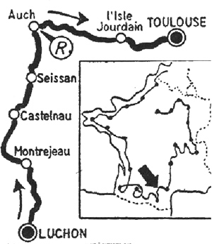 11h15 (Haute-Garonne) : N 125 Luchon (km 0) - Moustajon (km 2) - Antignac (km 3) - Le-Pont-de-Cazaux (km 8) - Cierp (km 14) - Pont-de-Chaum (km 17) - Estenos (km 19) - Bagiry (km 23) - (Hautes-Pyrénées) : Bertren (km 29) - Loures-Barousse - (Haute-Garonne) : La Broquière (km 31) - Montrejeau (km 37-CV) - (Hautes-Pyrénées) : Pinas (km 48) - Carr. N117/N129 (km 50) - N129 Montlong (km 61) - Castelnau-Magnoac (km 72-CV) - (Gers) : N129 Chelan (km 78) - Panassac (km 83) - Masseube (km 88) - Seissan (km 95-CV) - Ornezan (km 97) - Orbessan (km 101) - Pavie (km 109) - N21 Auch (km 114-ravitaillement) - N124 Aubiet (km 131) - Cahuzac (km 139) - Gimont (km 140) - L'Isle-Jourdain (km 158-CV) - Carr. N124/D121 (km 164) - (Haute-Garonne) : Saint-Lys (km 173) - D12 Seysses (km 186) - D15 Villeneuve-Tolosane (km 189) - Carr. D15/D24 (km 191) - Carr. D24/N20 (km 194) - Toulouse/Vélodrome (km 203).