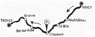 11h00 (Meurthe-et-Moselle) : Nancy/Av. Maréchal Leclerc (km 0) - N74 Neuves-Maisons (km 8) - Maizières (km 14) - Thuillez-aux-Groseilles (km 21) - Allain (km 27) - Colombey-les-Belles (km 30) - (Vosges) : Autreville (km 36) - Soulosse (km 49) - Neufchâteau (km 56-CV) - (Haute-Marne) : Liffol-le-Grand (km 66) - Liffol-le-Petit (km 72) - Pré-sous-Lafauche (km 74) - Saint-Blin (km 80-CV) - Andelot (km 89) - Rimaucourt (km 86) - Andelot (km 89) - Darmannes/Les Maisonnettes (km 101) - Chaumont (km 112-ravitaillement) - N19 Jonchery (km 119) - Blaisy (km 127) - Juzennecourt (km 130) - Colombey-les-Deux-Églises (km 139) - Villeneuve-aux-Frênes (km 143) - (Aube) : Lignol-le-Château (km 146) - Bar-sur-Aube (km 154-CV) - Ailleville (km 157) - Arsonval (km 160) - Maison-Neuve (km 162) - N396 Bossancourt (km 164) - Trannes (km 167) - La Rothière (km 172) - Brienne-le-Château (km 178-CV) - N60 Lesmont (km 188) - Piney (km 197) - La Belle-Épine (km 206) - Creney (km 213) - Pont Sainte-Marie (km 215) - Troyes/Stade de l'Aube (km 216).