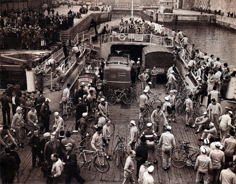 L'étape démarre de St-Brévin les Pins et le peloton embarque sur un bac pour traverser l'estuaire de la Loire.
