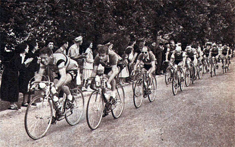 La jonction entre les deux groupes s'est opérée, 13 hommes en tête qui vont se jouer la victoire avec ici Luyten et Delberghe en tête... (photo Miroir-Sprint n° 631A du 7 juillet 1958).