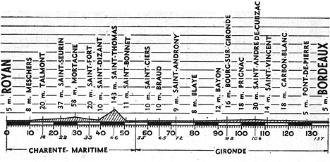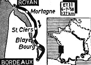 13h10 (Charente-Maritime) : Royan / Bd. F. Garnier (km 0) - Saint-Georges-de-Didonne (km 2) - D145 Meschers (km 10) - Talmont (km 15.5) - Saint-Seurin d'Uzet (km 23) - Mortagne-sur-Gironde (km 29) - Mageloup (km 32.5) - Saint-Fort-sur-Gironde (km 35) - Saint-Dizant du Gua (km 39) - Conac (km 43.5) - Saint-Thomas de Conac (km 45.5) - Saint-Sorlin de Conac (km 48) - Saint-Bonnet-sur-Gironde (km 50.5) - (Gironde) : D18 Saint-Ciers-sur-Gironde (km 59.5) - D9 Braud et Saint-Louis (km 64.5) - Saint-Androny (près de) (km 72) - Blaye (km 79.5) - Plassac (km 82.5) - N669 Carr. près de Roque de Thau (km 85.5) - Gauriac (km 87.5) - Bayon (près de) (km 89.5) - Saint-Seurin (km 91) - Bourg-sur-Gironde (km 93.5) - Prignac (km 99.5) - Saint-André de Cubzac (km 106) - N10 Cubzac-les-Ponts (km 109) - Saint-Vincent de Paul (km 111) - Marquet (km 114.5) - Carbon-Blanc (km 119) - Les Quatre-Pavillons (km 123) - Bordeaux / Pont de Pierre (km 128) - Bordeaux / vél. Parc Lescure (km 137).