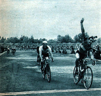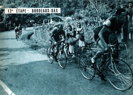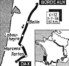 ![]() lundi 7 juillet 1958 ![]() 12h45 (Gironde) : Bordeaux - Talence (km 0) - N10 Gradignan (km 3) - La House (km 6) - Bellevue (km 7.5) - Jaugé (km 13.5) - Le Puch (km 16.5) - Le Barp (km 25.5) - La Vignole (km 29.5) - Beliet (km 36.5) - Belin (km 38.5) - Carr. près de Mons (km 41) - (Landes) : Le Muret (km 48.5) - Hourson-Crabot (km 50.5) - Liposthey (km 59) - Labouheyre (km 71.5) - Cap de Pin (km 79.5) - Laharie (km 91) - D38 Hourré (km 94) - Morcenx (km 99.5-ravitaillement) - Arjuzanx (km 104.5) - D114 Villenave (km 111.5) - Cangrand (km 125) - N134 Tartas (km 127.5) - D7 Audon (km 131.5) - Onard (km 134.5) - Saint-Geours d'Auribat (km 137.5) - Montfort-en-Chalosse (km 142.5) - D32 Hinx (km 150) - Candresse (km 154) - Dax / Parc municipal (km 161). ![]() ![]() ![]() 105 partants. Météo : temps couvert et averses. - Pour une fois, le début de l'étape est calme mais le temps est toujours pluvieux. Il ne se passe rien pendant 100 kilomètres hormis une tentative de Van den Borgh au km 36 à laquelle le maillot jaune Darrigade met bon ordre et quelques problèmes mécaniques pour Charly Gaul qui échange son vélo avec celui d'Ernzer. - Avec une demi-heure de retard sur l'horaire, le peloton arrive au ravitaillement de Morcenx (km 99.5) où Hoorelbeke met le feu aux poudres. Aussitôt rejoint, c'est Van Geneugden qui repart, relayé par Pinteralli puis par Darrigade qui ramène le peloton. Au km 112, un trio réussit à se détacher. Il est formé de Foré, Morvan & Rolland et compte 15" d'avance au km 115 mais ils sont rejoints 2 kilomètres plus loin. Une courte attaque du maillot jaune au km 123 entraîne une échappée composée de Van Geneugden, Hoevenaers, P. Van Est, Galdeano et Gainche lesquels sont rejoints par Anglade. Ils ont bientôt 30" d'avance au km 130 puis 1' au km 134. - Au km 128, Padovan puis Delberghe s'intercalent tandis que derrière, une chute se produit au km 134 qui entraîne à terre Cérami, Annaert, Nascimbene, Malléjac, David & Rolland. Pino Cérami est le plus touché mais il finira l'étape. Le groupe de tête accentue son avance qui passe à 3' aux 10 kilomètres. A 200 mètres de la piste du vélodrome, Gainche démarre et pénètre le premier sur la piste mais il est débordé sans discussion par Van Geneugden. Delberghe et Padovan arrivent à 2'20" tandis que le peloton réglé par Darrigade pointe à 3'26". André Darrigade conserve le maillot jaune pour la première étape pyrénéenne demain. ![]() Étape : ![]() 1. Martin Van Geneugden (Bel) en 4h11'19" (moy : 38.437 km/h) 2. Jean Gainche (Fra) 3. Jos Hoevenaers (Bel) 4. Piet Van Est (Hol) 5. Jesus Galdeano (Esp) 6. Henry Anglade (Fra) 7. Édouard Delberghe (Fra) à 2'20" 8. Arrigo Padovan (Ita) 9. André Darrigade (Fra) à 3'26" 10. Jean Graczyk (Fra) 11. Gilbert Bauvin (Fra) 12. Pierino Baffi (Ita) 13. Wim Van Est (Hol) 14. Robert Varnajo (Fra) 15. Gilbert Desmet 1 (Bel) 16. Adolf Christian (Aut) 17. Horst Tüller (All) 18. Nicolas Barone (Fra) 19. Jacques Anquetil (Fra) 20. Antonin Rolland (Fra) 21. Jean-Claude Grêt (Sui) 22. Luis Otano (Esp) 23. Jozef Planckaert (Bel) 24. Brian Robinson (Gbr) 25. Joseph Groussard (Fra) 26. Georges Gay (Fra) 27. Miguel Bover (Esp) 28. Fernand Picot (Fra) 29. Mathias Löder (All) 30. Anton Graeser (Sui) 31. Hendrik Luyten (Bel) 32. Giuseppe Pintarelli (Ita) 33. Marcel Ernzer (Lux) 34. Camille Le Menn (Fra) 35. Maurice Moucheraud (Fra) 36. Joseph Thomin (Fra) 37. Ernest Ecuyer (Sui) 38. Martin Van den Borgh (Hol) 39. André Vlayen (Bel) 40. Aldo Bolzan (Ita) 41. André Dupré (Fra) 42. Vito Favero (Ita) 43. Roger Chaussabel (Fra) 44. Antonino Baptista (Por) 45. Fernand Lamy (Fra) 46. Serge David (Fra) 47. Jean Dacquay (Fra) 48. Armand Desmet (Bel) 49. Stan Brittain (Gbr) 50. Mario Bertolo (Ita) 51. Jean Bourlès (Fra) 52. Antonio Suarez (Esp) 53. Francisco Moreno (Esp) 54. Hans Andresen (Dan) 55. Gerrit Voorting (Hol) 56. Robert Roudaut (Fra) 57. Tino Sabbadini (Fra) 58. Antonio Barbosa (Por) 59. Joseph Morvan (Fra) 60. Piet Damen (Hol) 61. Franz Reitz (All) 62. Jaap Kersten (Hol) 63. Louis Bergaud (Fra) 64. Jean Stablinski (Fra) 65. Seamus Elliott (Irl) 66. François Mahé (Fra) 67. Ernst Traxel (Sui) 68. Carmelo Morales (Esp) 69. Jempy Schmitz (Lux) 70. Jean Malléjac (Fra) 71. Pierre Polo (Fra) 72. Jan Adriaensens (Bel) 73. Jean Brankart (Bel) 74. Bernardo Ruiz (Esp) 75. Raymond Hoorelbeke (Fra) 76. Lothar Friedrich (All) 77. Gianni Ferlenghi (Ita) 78. Pietro Nascimbene (Ita) 79. Louison Bobet (Fra) 80. Charly Gaul (Lux) 81. Noël Foré (Bel) 82. Marcel Rohrbach (Fra) 83. Stanislas Bober (Fra) 84. Salvador Botella (Esp) 85. Rizzardo Brenioli (Ita) 86. Piet De Jongh (Hol) 87. Manuel Busto (Fra) 88. Fernando Manzaneque (Esp) 89. Francis Pipelin (Fra) 90. Federico Bahamontes (Esp) 91. Gastone Nencini (Ita) 92. Emilio Bottecchia (Ita) 93. René Privat (Fra) 94. Kaj Allan Olsen (Dan) 95. Raphaël Géminiani (Fra) 96. Claude Colette (Fra) 97. Jean Dotto (Fra) 98. Hans Hollenstein (Sui) 99. Walter Favre (Sui) 100. Roger Walkowiak (Fra) 101. Maurice Quentin (Fra) 102. Jean-Claude Annaert (Fra) 103. Nino Catalano (Ita) 104. Gilberto Dall'Agata (Ita) 105. Pino Cerami (Bel) à 11'04" Bonification : 1' Van Geneugden, 30" Gainche Prix de la combativité : n.a. Classement général: ![]() 1. André Darrigade (Fra) en 54h31'02" 2. Vito Favero (Ita) à 23" 3. Gerrit Voorting (Hol) à 38" 4. François Mahé (Fra) à 41" 5. Jean Graczyk (Fra) à 46" 6. Raphaël Géminiani (Fra) à 1'47" 7. Seamus Elliott (Irl) à 2'43" 8. Gilbert Desmet 1 (Bel) à 3'04" 9. Gilbert Bauvin (Fra) à 6'23" 10. Salvador Botella (Esp) à 6'33" 11. Jozef Planckaert (Bel) à 7' 12. Joseph Morvan (Fra) à 8'19" 13. Martin Van den Borgh (Hol) à 8'44" 14. Jean Gainche (Fra) à 9'16" 15. Jacques Anquetil (Fra) à 10'06" 16. Martin Van Geneugden (Bel) à 10'25" 17. Nicolas Barone (Fra) à 10'29" 18. Jan Adriaensens (Bel) à 11'13" 19. Charly Gaul (Lux) à 11'31" 20. Brian Robinson (Gbr) à 11'51" 