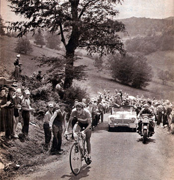 Bahamontes, l'enfant de Tolède, a passé tous les cols pyrénéens en tête, ici le Portet d'Aspet