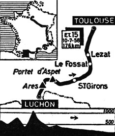 - Dès la remontée sur le col de Portet d'Aspet, l'Espagnol reprend le large et à 4 kilomètres du sommet, son avance est de 1'15" sur Schmitz et 1'20" sur le peloton. Gaul revient sur son compatriote et le lâche. Au col de Portet d'Aspet (km 49), Bahamontes précède Gaul de 44", à 1'35" Dotto à la tête d'un peloton comprenant Damen, Anquetil, Favero, Géminiani, Brankart et Bobet... entre'autres. G. Desmet et Nencini sont à 1'55" et Bauvin à 2'. Gaul et Bahamontes n'insistent pas et au km 59, un peloton "maillot jaune " d'une quarantaine de coureurs s'est regroupé à l'avant. Le maillot vert Graczyk (4ème au C.G.) est dans un deuxième paquet de même taille avec Walkowiac, Mahé (3ème au C.G), A. Desmet, Cerami etc. L'écart est de 3' au km 79 mais il s'accroît considérablement pour atteindre 6'25" au km 100 ! Un autre groupe avec Privat, Eliott, Morvan, Brittain etc. passe à 8'20". Au ravitaillement du Mas d'Azil (km 103) l'écart entre les deux pelotons est de 8', au km 110 : 10'15", au km 125 : 13', au km 136 : plus de 16'.