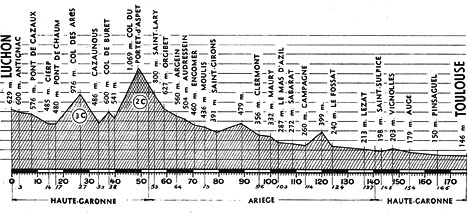 12h00 (Haute-Garonne) : N125 Luchon (km 0) - Moustajon (km 2) - Antignac (km 3) - Pont de Cazaux (km 8) - Cierp (km 14.5) - Pont de Chaum (km 17) - N618 Fronsac (km 19) - Col des Ares (km 27.5-GPM3) - Cazaunous (près de) (km 33.5) - Juzet-d'lzaut (km 36.5) - Col de Buret (km 37.5) - Hennemorte (km 44) - Col du Portet-d'Aspet (km 49-GPM2) - Portet-d'Aspet (km 51) - (Ariège) : Saint-Lary (km 55) - Augirein (près de) (km 56.5) - Orgibet (km 58.5) - Yllartein (km 60.5) - Aucazein (km 61.5) - Argein (km 63.5) - Audressein (km 67) - Engomer (km 70.5) - Luzenac (km 73) - Moulis (près de) (km 74.5) - Saint-Girons (km 79) - Carr. N117-N119 près de Lescure (km 87.5) - Clermont (km 95.5) - Le Saret (km 98.5) - Maury (km 99.5) - Le Mas-d'Azil (km 103-ravitaillement) - Sabarat (km 108.5) - N628 Campagne (km 113.5) - D14 Carla-Bayle (près de) (km 120.5) - D9 Le Fossat (km 124) - N626 Lezat (km 136.5) - (Haute-Garonne) : D4 Saint-Sulpice (km 143) - Carr. Augé (km 154) - Le Canton (km 158) - N20 Pinsaguel (km 162) - Toulouse / Stade vélodrome (km 176).