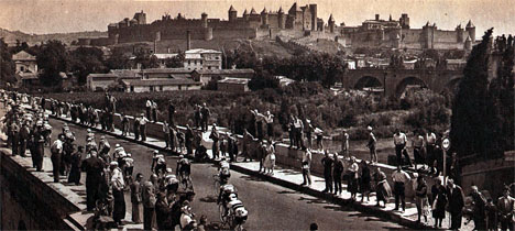 Sous un chaud soleil, le peloton passe à Carcassonne et ses célèbres remparts