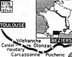 11h40 (Haute-Garonne) : Toulouse (km 0) - N113 Ramonville-la-Bourdette (km 3.5) - Ramonville-Sainte-Agne (km 5) - Le Grand Chemin (km 6.5) - Castanet (km 8.5) - Pechabou (km 10) - Pompertuzat (km 11.5) - Montgiscard (km 17) - Baziège (km 21.5) - Villenouvelle (km 26) - Villefranche-de-Lauragais (km 32) - Avignonet-Lauragais (km 39) - (Aude) : Seuil de Naurouze (km 42.5) - Labastide-d'Anjou (km 44.5) - Castelnaudary (km 54) - N113 Villepinte (km 60) - Alzonne (km 74) - Pezens (km 82) - Carcassonne (km 90.5-ravitaillement) - Carr. Les Capucins (km 97.5) - N610 Trèbes (km 98.5) - Marseillette (km 107.5) - Puicheric (km 115.5) - D72 La Redorte (km 121) - Azille (km 124) - D206 Pépieux (km 127) - (Hérault) : Olonzac-en-Minervois (km 131) - N610 Beaufort (km 134) - Aigne (km 140) - Aigues-Vives (km 141) - D20 Agel (km 144.5) - (Aude) : Carr. D128-D26 (km 147) - (Hérault) : D20 Villespassans (km 153) - D36E Cebazan (km 158.5) - N112 Puisserguier (km 165.5) - D16 Capestang (km 170.5) - Montady (km 177.5) - Béziers / Stade de Sauclières (km 187).