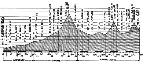 11h40 (Vaucluse) : D7 Carpentras (km 0) - D7 Aubignan (km 4.5) - Vacqueyras (km 10) - Sablet (km 17.5) - D7 Roaix (km 23) - N575 Vaison-la-Romaine (km 29) - D54 Entrechaux (km 35.5) - (Drôme) : Mollans (km 41.5) - Pierrelongue (km 44) - Le Buis-les-Baronnies (km 51) - N546 Sainte-Euphémie (km 62.5) - Carr. près de St-Auban (km 67) - D65 Montguers (km 69) - La Combe (km 72) - Ruissas (km 76.5) - Col de Perty (km 85.5-GPM3) - Laborel (km 94.5) - (Hautes-Alpes) : D30 Les Bègues (km 99) - Orpierie (km 103.5) - Le Bachas (km 105) - Eyguians (km 111.5) - N75 Laragne (km 117-ravitaillement) - Lazer (près de) (km 121) - N85 Le Vivas (km 133.5) - D19 Lardier et Valença (km 141) - Col de Foreyssasse (km 144-GPM3) - Fouillouse (km 148) - D199 Tallard (km 154) - Valserres (km 164.5) - Jariayes (km 169.5) - Col de la Sentinelle (km 171.5-GPM2) - Gap / Av. J. Jaurès (km 178).