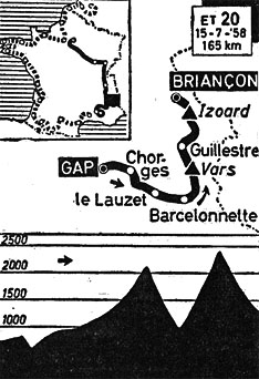 - Au contrôle de ravitaillement de Guillestre (km 110), Bobet surprend ses adversaires et démarre. Au km 117, il a pris 1' d'avance mais un kilomètre plus loin il perce et se voit dépassé par le groupe des favoris ! Deux kilomètres plus loin c'est au tour d'Anquetil et de Catalano. Alors que le Normand chasse pour revenir avec Dotto, il crève à nouveau. Au km 123, Bobet est à 30" et Anquetil à 1' du groupe "maillot jaune" composé de Géminiani, Pipelin, Walkowiac, Gaul, Adriaensens, Hoevenaers, Nencini, Cerami, Bottecchia, Bahamontes & Gainche. Au km 127, Anquetil, Nascimbene et Ferlenghi rejoignent Bobet attendu par Pipelin. Ces cinq hommes recollent ensuite au groupe des favoris.