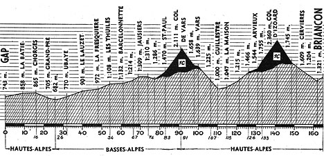 Dans le col de Vars, le groupe des favoris ne s'est pas désuni et passe au sommet à plus de 7' de Catalano et à 2'10" de Bahamontes