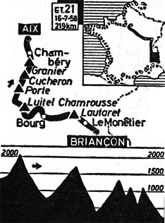 - Les montagnes "russes" de la Chartreuse continuent avec l'ascension du col du Granier qui confirme la tendance et la menace Favero se précise pour le maillot jaune. Au sommet (km 188), les écarts prennent des proportions dantesques : Gaul en tête, à 6'20" Adriaensens, à 9'10" Favero, à 10'35" Ferlenghi, à 12'25" Damen, Dotto, Planckaert et Géminiani etc. Anquetil défaillant et Walkowiac sont à 17'15", Bobet à 18'25", Nencini à 19'00". On est alors à 30 km du but.