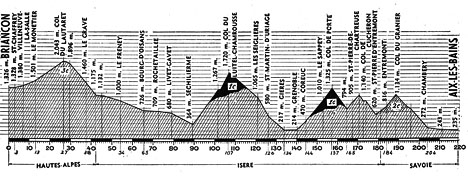 9h15 (Hautes-Alpes) : N91 Briançon (km 0) - Saint-Chaffrey (km 3) - Villeneuve-la-Salle (km 7) - Le Monetier-les-Bains (km 13) - Col du Lautaret (km 26.5-GPM3-SHD) - Le Grave (km 37.5) - (Isère) : Le Freney (km 54) - Bourg-d'Oisans (km 65.5-ravitaillement) - La Paute (km 68) - Les Sables (km 70) - Rochetaillée (km 72.5) - Livet-Gavet (km 79) - Séchilienne (km 89.5) - D111 Col du Luitel-Chamrousse (km 107-GPM1) - Les Seiglières (km 121) - St-Martin-d'Uriage (km 126) - D280 Uriage (km 128) - N524 Gières (km 134) - N523 Grenoble (km 140-ravitaillement) - N512 Corenc (km 144.5) - Le Sappey (km 153) - Col de Porte (km 157.5-GPM1) - Saint-Pierre-de-Chartreuse (km 167) - Col du Cucheron (km 170.5-GPM3) - Saint-Philibert (km 173) - Saint-Pierre-d'Entremont (km 179) - (Savoie) : Entremont-le-Vieux (km 184) - Col du Granier (km 188.5) - Chambéry (km 204) - N201 - Aix-les-Bains / Circ. auto de la Plage (km 219).