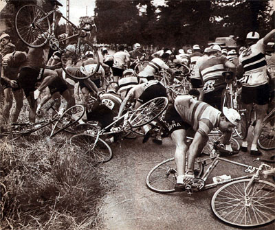 La chute collective du km 125. Chacun essaye de récupérer son vélo dans ce chaos.