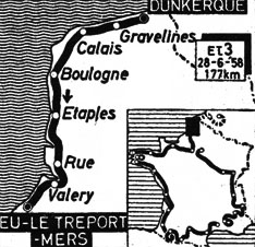 - Au km 5, Fallarini, Lavigne, De Jongh, Foré, Stablinski, Groussard, Luyten, Bourlès & Schmitz tentent leur chance, mais 2 kilomètres plus loin, tout est rentré dans l'ordre. Au km 17, Ferlenghi n'a pas plus de succès. La bonne échappée se dessine dès le km 29. Deux "tricolores" Bauvin et Stablinski, Foré, Favero, Wim Van Est, Lamy et Annaert s'échappent et l'écart va grandir vite : km 31 : 20", km 36 : 45", km 45 : 40", km 53 : 3'10", km 64 : 4'20", km 78 : 5', km 100 : 6'40". Derrière, Schmitz, Catalano et Graczyk, tombés au km 28, réintègrent le peloton au km 53 tandis que Christian a tenté vainement de rejoindre les "sept" et que dans la traversée de Calais (km 39), Annaert a enlevé une grosse prime.