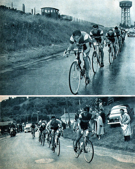Soucieux de distancer leurs principaux rivaux (Gaul, Brankart, Bahamontes...) on voit Anquetil le vainqueur du Tour 57 (haut) et Bobet suivi de Géminiani (bas) dans la côte de Boissey, emmener vigoureusement les échappés.