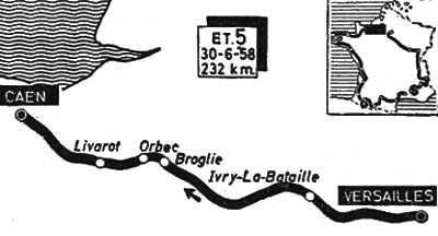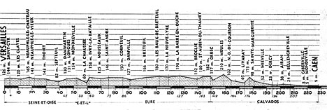 10h15 (Seine-et-Oise) : N10 Versailles (km 0) - Saint-Cyr (km 4) - D11 Fontenay-le-Fleury (près de) (km 6.5) - Trou Moreau (km 8) - Les Clayes (km 11.5) - Les Petits-Prés (km 14.5) - La Boissière (km 16.5) - Neauphle-le-Château (km 18) - Le Pontel (km 20) - Neauphle-le-Vieux (km 21.5) - D76 Thoiry (km 30) - Goupillières (près de) (km 33) - D130 Septeuil (km 39) - D11 Dammartin-en-Serve (km 45) - Longues (km 48) - N828 Mondreville (km 52) - (Eure-et-Loir) : Le Mesnil-Simon (km 53) - Gatines-Rouges (km 55.5) - D216 La Chaussée d'Ivry (km 59) - (Eure) : Ivry-la-Bataille (km 60.5) - N833 Couture-Boussey (km 65) - Mousseaux (km 69.5) - Saint-André-de-l'Eure (km 75) - Les Authieux (km 78) - Bailleul (km 81) - N154 Corneuil (km 85.5) - Damville (km 90.5) - Anthenay (km 93) - Gouville (km 97) - Le Chesnay (km 101) - Breteuil-sur-Iton (km 102.5) - Les Baux-de-Breteuil (km 112) - La Neuve-Lyre (km 118.5) - La Vieille-Lyre (km 119.5) - La Barre-en-Ouche (km 126.5) - D49 Le Boulai (km 130) - Broglie (km 139.5) - Saint-Aubin-du-Thenney (km 143.5) - (Calvados) : D4 Orbec-en-Auge (km 150.5-ravitaillement) - D46 Meulles (km 158.5) - D4 Notre-Dame-de-Courson (km 164) - Livarot (km 174) - Sainte-Marguerite (km 181) - Boissey (km 184.5) - Hiéville (km 188) - Saint-Pierre-sur-Dives (km 190) - D138 Percy-en-Auge (km 196) - La Dime / carr. D47 (km 199) - D47 Canon (km 200.5) - Ouezy (km 201.5) - Cesny-aux-Vignes (km 203) -