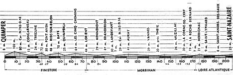 11h15 (Finistère) : Quimper (km 0) - Croix-Neuve (km 19) - Concarneau (km 21.5) - Kerviniold (km 21.5) - Tregunc (km 28) - Croissant-Kergoz (km 31) - Pont-Aven (km 36.5) - Riec-sur-Belon (km 41) - Baye (km 48.5) - Quimperlé (km 53.5) - (Morbihan) : N165 Les Cinq-Chemins (km 63.5) - Lorient (km 73.5) - N24 Lanester (km 77) - Hennebont (km 83.5) - N165 Branderion (km 90.5) - Treauray (km 93.5) - Landevant (km 97) - Auray (km 111.5) - Vannes (km 130-ravitaillement) - Poulfranc (km 132.5) - Saint-Léonard (km 134) - Theix (près de) (km 139) - La Trinité-Surzur (km 144) - Muzillac (km 154.5) - La Corne de Cerf (km 162.5) - La Roche-Bernard (km 168) - (Loire-Atlantique) : N774 Le Quesnet-Duret (km 174) - Herbignac (km 176) - D47 Caillaudin (km 181) - Saint-Lyphard (km 182.5) - Le Crutier (km 188.5) - Saint-André-des-Eaux (km 193.5) - Saint-Nazaire / entrée circuit (km 202.5) - Saint-Nazaire / Av. de Plaisance (km 206).