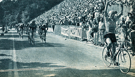 Le sprinteur André Darrigade s'est accroché sur Aspin et Peyresourde et voit ses efforts récompensés sur le circuit auto de Saint-Gaudens. Un maillot vert remportant une étape de montagne, ça n'est pas si courant!