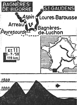 - Dans la descente jusqu'à Bagnères-de-Luchon (km 71), seuls Adriaensens et Hoorelbeke parviendront à recoller au groupe "maillot jaune". A la sortie du ravitaillement, 24 hommes se sont regroupés à 2'05" derrière Huot toujours seul devant. A Pont de Chaum (km 89), Huot possède 2'05" d'avance mais il commence à faiblir bien qu'à trois reprises ses poursuivants soient stoppés par des passages à niveau fermés! Deledda demande à son coureur de stopper ses efforts lorsque l'écart ne sera plus que de 30". Dès lors la victoire va se jouer entre ces 25 coureurs parmi lesquels Darrigade en est le clair favori.