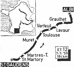 - La caravane commence à s'endormir avant que la crevaison de Darrigade la secoue. Il est dépanné par Privat et ramené par Stablinski mais le Belge Desmet, à 1'17" seulement du maillot jaune, tente crânement sa chance au km 157, avant Laboutarié. Il est rapidement suivi de Picot, Groussard, Hassenforder et Schellenberg. Les 5 se rapprochent à 50" du duo de tête mais finalement tout est à refaire à la sortie de Réalmont (km 165) car le peloton a repris tout le monde ! Il reste 20 kilomètres avant l'arrivée.