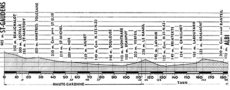 11h50 (Hautes-Garonne) : Saint-Gaudens/Rte de Toulouse (km 0) - N117 Beauchalot (km 10.5) - Lestelle (km 14.5) - Saint-Martory (km 18) - N125 Mancioux (km 21.5) - Martres-Tolosane (km 28) - Poulejon (km 35) - Carr. près Saint-Élix (km 41) - N125 Saint-Michel (km 47) - N125 Noé (km 55) - Muret (km 68-CV) - N20 (km 77) - N20 Toulouse (km 89-CV) - N112 Gramont (km 95) - Montrabe (km 98) - Beaupuy (km 105) - Verfeuil (km 109) - Saint-Sernin (km 112) - (Tarn) : Le Ramel (km 116) - Lavaur (km 126-ravitaillement) - N631 (km 132) - Briatexte (km 140) - Graulhet (km 147) - Laboutarié (km 158) - Réalmont (km 164) - N118 - Carr. avant Ranteil (km 180) -