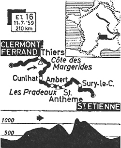 - Jusqu'à Thiers (km 41), les coureurs sont fatigués et grognons, la course se traîne et prend 1/4 d'heure de retard. La côte de Margeride (km 45) sort à peine le peloton de sa torpeur. Rivière pique un petit sprint dans les tous derniers mètres et prend les 3 pts du classement des grimpeurs. Cela suffit cependant à larguer Privat et Busto puis d'autres comme Meneghini, Cardoso, Reitz, Le Dissez etc. Personne ne tente quoi que ce soit jusqu'au ravitaillement d'Ambert (km 122). Privat abandonnera tandis que Robic casse son cadre de vélo et crie au sabotage !