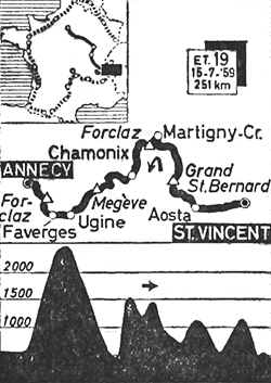 une visibilté quasi-nulle. Heureusement, les montagnards ont allumé des feux de bois qui jalonnent plus ou moins la route et ses précipices ! Morales chute et se fait dépassé par tout le monde, de même Huot est très loin. Toute la descente s'effectue à 20 km/h jusqu'au ravitaillement de Martigny-Croix (km 104) où arrive des coureurs transformés en bonhommes de boue et débute l'ascension du Forclaz sur cette fois-ci une route dans un état parfait. Le peloton qui s'était regroupé "fond" par l'arrière avec des décrochages nombreux dont Géminiani, Gomez del Moral, Morales, Kersten, Desmet, De Bruyne etc. Bahamontes le maillot jaune est isolé. Graf s'isole en tête et prend 45" d'avance sur Saint qui le rejoint avant le sommet. Le col (km 117.5) est franchi en tête par Gérard Saint devant Graf, à 2'35" Gaul, Sutton, Bahamontes & Reitz, à 2'45" Damen, Mahé, Hoevenaers, Pauwels, Rvière, Baldini, Darrigade, Anquetil, Brankart, Planckaert, Adriaensens, Anglade, Thomin & Bergaud. A noter qu'Anglade, après un gros ennui mécanique, s'est retrouvé derrière nombre d'attardés et a repassé tout le monde sans que personne ne puisse prendre la roue du champion de France !
