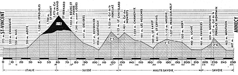 - Bizarrement le revêtement dans la descente est en très mauvais état mais seul Damen perce et décroche du groupe de chasse d'une vingtaine de coureurs. Au Châtelard (km 125.5), on rentre en France. Devant Graf crève également et a du mal à réparer. Saint en profite pour remporter un Prix des Stations du Mont-Blanc (un classement sur 5 ascensions) richement doté. Le Suisse prend jusqu'à 4' de retard sur le Normand mais encouragé par son D.S, il ne se laisse pas absorber par le groupe de chasse et repart de plus belle. A St-Gervais (km 167), il est à 3'50" et le peloton à 6'45", à Megève (km 174) : 1'54" et 6'20", à Flumet (km 188) : 1'30" et 6', à Héry (km 195) : 1'20" et 5'20", à Ugine (km 204) : 1'10" et 7'15". Le peloton a laissé tombé et il reste une cinquantaine de kilomètres et un col au Suisse pour combler son retard.
