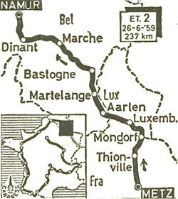 10h33 (Moselle) : Metz/Rte de Thionville (km 0) - N53 Maizières-lès-Metz (km 10) - Talange (km 13) - Hagondange (km 14-CV) - Mondelange (km 15) - Richemont (km 17-CV) - Uckange (km 19.5) - Thionville (km 26.5-CV) - D1 Garche (km 32) - Cattenom (km 35.5) - Sentzich (km 37.5) - Beyren (km 43.5) - Mondorff (km 47.5) - (LUXEMBOURG) - Mondorf-les-Bains (km 48) - Altwies (km 49) - Filsdorf (km 50.5) - Hassel (km 57) - N3 Hesperange (km 59.5) - Luxembourg (km 64.5-CV) - N6 Strassen (km 69) - Marner (km 72.5) - Capellen (km 76) - N13 Seinfort (km 82) - (BELGIQUE) - N4 Arlon (km 90.5) - Attert (km 99) - Materlange (km 109.5) - Bastogne (km 130.5-ravitaillement) - Barrière de Champion (km 154.5) - Bande (près de) (km 163) - Marche (km 173.5-CV) - Hogne (km 178.5) - Haversin (km 183.5) - Haïd (km 185.5) - Leignon (km 191.5) - N38 Achène (km 196) - N36 Sorinnes (km 200.5) - Dinant (km 206-CV) - N17 Anhee (km 213.5) - Profondeville (km 233) - Wepion (km 229.5) - Pied de la Citadelle (km 2345.5) - Namur/Citadelle (km 237).