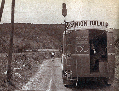 ... tandis qu'à l'arrière, le camion-balai attendra vainement l'abandon de Jean "biquet" Robic. Hors-délais, il fait ses adieux au Tour de France.