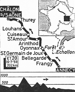 Le peloton aborde la dernière difficulté répertoriée de ce Tour 1959, la forêt d'Échallon. Saint attaque mais Gaul ne veut pas se faire prendre sa 2ème place au classement des grimpeurs et revient sur lui. Le Français n'insiste pas. Au sommet (km 63.5), Dotto passe en tête devant Robinson à 10" et Gaul avec une avant-garde à 35" et le peloton à 1'30". Robic passe à 4', Wierucki encore plus loin. Dans la descente, Dotto se relève mais le Britiannique insiste. Dans la traversée d'Oyonnax (km 71), il a déjà 1' d'avance, à Chancia (km 82.5) c'est 3'25" puis 5'40" dans le raidillon de Vesles (km 91) où Wierucki abandonne.