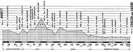 11h00 (Haute-Savoie) : Annecy/Av. de Cran (km 0) - N508 Cran (km 1) - Gillon (km 3) - La Balme-de-Sillingy (km 8.5) - Frangy (km 23) - N92 Mons (km 27) - N508 Vanzy (km 29) - (Ain) : Bellegarde (km 39-CV) - N84 Châtillon-de-Michaille (km 44) - Saint-Germain-de-Joux (km 51) - Échallon-Miribel (km 57.5) - D49 Échallon-le-Crêt (km 59.5) - Forêt d'Échallon (km 63.5-GPM3) - Oyonnax (km 71-CV) - D31 Dortan (km 79) - (Jura) : N436 Chancia (km 82.5) - D99 Vescles (km 91) - D3 Arinthod (km 102-CV) - Lains (km 114) - Saint-Julien-sur-Suran (km 118) - Andelot-lès-St-Amour (km 124.5) - Thoissia (km 126.5) - St-Amour (km 136.5-ravitaillement) - N83 Balanod (près de) (km 138.5) - (Saone-et-Loire) : Joudes (km 140.5) - Cuiseaux (km 144) - N472 Le Villard (km 149.5) - Le Miroir (km 151.5) - Les Galands (km 154.5) - La Grange-du-Fond (km 158.5) - N396 Louhans (km 164-CV) - Le Monceau (km 168) - Meix-Perrot (km 173) - Simard (km 175) - D178 Thurey (km 180) - N477 Lessard-en-Bresse (km 182.5) - Cortot (km 191.5) - Oslon (km 196.5) - N83B St-Marcel (km 198.5) - N78 Chalon-sur-Saône/Quai Gambetta (km 202).