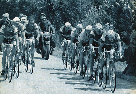 La bonne échappée fonce vers Rennes, de gauche à droite : Everaert, De Jongh, Favero, Galdeano (Hoevenaer masqué), Baffi, Darrigade maillot vert, Pipelin, Graczyk & Privat.