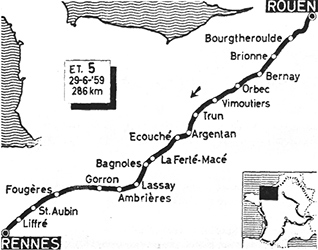 - Au km 158, à l'entrée dans La Ferté-Macé, Janssens, Baldini et Kool se détachent et prennent une vingtaine de secondes d'avance. Ils s'inclinent au km 162. Aussitôt, Géminiani attaque, mais Baldini ramène le peloton sur lui. Géminiani repart à Ba-gnoles-de-l’Orne (km 164), suivi par Baldini, Gismondi, Darrigade, Meneghini, Pipelin, Busto, Bruni, Bouvet et Van Aerde. Les deux "Tricolores" coupent l’allure. Derrière Gaul mène la chasse à fond. Au km 174, en tête, Gismondi, Bruni et Meneghini chutent. Les autres se laissent alors rejoindre.
