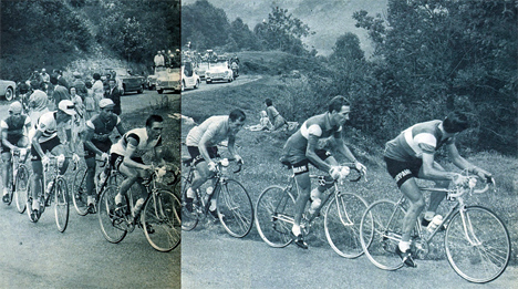 - Dans la descente vers Laruns, Rostollan fonce et rejoint Battistini. Derrière eux et Manzaneque intercalé, Nencini, Rivière & Planckaert se regroupent. Le Belge reçoit la consigne d'attendre Adriaensens. Rivière et Nencini rattrappent Manzaneque puis reviennent sur le duo de tête. 5 hommes donc au 1er échelon de la course. Au km 220, à 28 bornes de la ligne, la situation est la suivante : Battistini, Nencini, Rivière, Rostollan & Manzaneque, à 30" Adriaensens, Anglade, Mahé, Planckaert, Massignan & Geldermans, à 1'45" un groupe de 14 coureurs dont Junkermann, Privat & Simpson qui a chuté 2 fois !