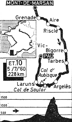 - Hormis une tentative de Busto dès le départ, et quelques timides attaques, le début de course est calme, très calme. La montagne intimide, rien à voir avec les jours précédents. A Montgaillard (km 112), la course passe à 14h02 soit 23 minutes de retard sur l'horaire lent (38 km/h). Dans la côte après Loucrup (km 117), 13 coureurs dont Simpson, Anglade & Massignan s'échappent mais cela ne va pas très loin. Néanmoins le peloton se réveille et Busto, Marigil, Rostollan, Wim Van Est, Battistini, Pauwels et le maillot jaune Adriaensens prennent le large. A Lourdes ils comptent 35" d'avance et 1'10" cinq bornes plus loin. Ils atteignent le ravitaillement d'Argelès-Gazost (km 141) 1'30" avant le peloton.