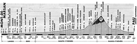 10h30 (Landes) : Mont-de-Marsan / Av. de Grenade (km 0) - N649 - N124 Grenade-sur-Adour (km 13.5) - Bordères et Lamensans (km 18.5) - Cazères-sur-l'Adour (km 23) - Aire-sur-Adour (km 31.5-CV) - (Gers) : Barcelonne du Gers (km 33.5) - N135 Saint-Germé (km 41) - Riscle (km 48.5) - Cahuzac (km 54) - (Hautes-Pyrénées) : N135 Laloncagne (km 59.5) - Maubourguet (km 74.5) - Nouilhan (près de) (km 78.5) - Vic-Bigorre (km 83.5-ravitaillement) - Pujo (km 87.5) - Andrest (km 90.5) - Tarbes (km 100.5) - Laloubère (km 104) - Horgues (km 106) - Momères (km 107.5) - Saint-Martin (km 109) - Arcizac-sur-Adour (km 110) - Hiis (près de) (km 112) - Montgaillard (km 114) - N637 Loucrup (km 117) - Escoubès (km 121) - Arcizac-ez-Angles (km 123.5) - Lourdes - N21 Lugagnan (près de) (km 129) - Agos-Vidalos (km 135.5) - Ayzac-Ost (km 138.5) - Argelès-Gazost (km 141-ravitaillement) - La Lanne - Arras-en-Lavedan (km 144) - Aucun (km 150) - Marsous (km 151) - Arrens (km 153) - Col du Soulor (km 161) - (Basses-Pyrénées) : Col d'Aubisque (km 171-GPM1) - Gourette - Les Chalets d'Ossau - Eaux-Bonnes (km 183) - N134bis Laruns (km 189-CV) - Bielle (km 196.5) - Louvie-Juzon (km 200) - Sévignacq-Meyracq (km 203.5) - Rébénacq (km 210) - Gan (km 218) - Pau / circ. automobile (km 228).