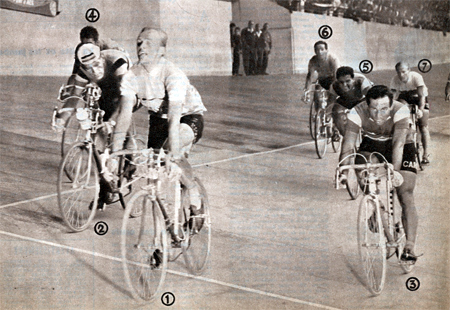 Sur le vélodrome de Toulouse, Jean Graczyk, maillot vert, s'impose devant Van Aerde, Defilippis, Geldermans, Bruni, Nencini, Darrigade.