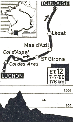 - Au km 36, Graczyk le maillot vert démarre et emmène Nencini le maillot jaune dans sa roue. Le peloton réagit et revient mais Graczyk repart avec Sabbadin et Queheille... vainement. Le Français insiste et finit par se retrouver à l'avant avec Junkermann, Defilippis et 2 équipiers du maillot jaune Sabbadin et Battistini mais c'est encore regroupé que le peloton débute la montée du Portet d'Aspet. Sous la pluie qui se met à tomber, le peloton monte à bonne vitesse les premiers kilomètres les plus raides. Planckaert démarre pourtant et entraîne avec lui dans un premier temps Rohrbach, Junkermann, Rivière, Nencini & Battistini puis le Belge s'isole pour franchir le sommet en tête avec 10" sur Junkermann, 25" sur Anglade, 30" sur Piet Van Est, 35" sur Pavard, 40" sur Rohrbach, Nencini, Rivière & Gimmi etc. Adriaensens est à 55", le reste du peloton à 1'15".