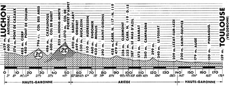 12h10 (Haute-Garonne) - Luchon (km 0) - N125 Moustajon (km 2) - Antignac (km 3) - Pont-de-Cazaux (km 8) - Cierp (km 14.5) - Pont-de-Chaum (km 17) - N618 Fronsac (km 19) - Col des Ares (km 27.5-GPM3) - Cazaunous (près de) (km 33.5) - Juzet d'Izaut (km 36.5) - Col de Buret (km 37.5) - Henne-Morte (km 44) - Col de Portet d'Aspet (km 49-GPM2) - Portet d'Aspet (km 51) - (Ariège) : Saint-Lary (km 55) - Augirein (près de) (km 56.5) - Orgibet (km 58.5) - Illartein (km 60.5) - Aucazein (km 61.5) - Argein (km 63.5) - Audressein (km 67) - Engomer (km 70.5) - Luzenac (km 73) - Moulis (près de) (km 74.5) - Saint-Girons (km 79-CV) - Lescure (près de) (km 87.5) - Clermont (km 95.5) - Le Sérat (km 98.5) - Maury (km 99.5) - Le Mas d'Azil (km 103-ravitaillement) - Sabarat (km 108.5) - N623 Campagne (km 113.5) - D14 Carla-Bayle (près de) (km 120.5) - D9 Le Fossat (km 124) - N626 Lezat-sur-Leze (km 136.5-CV) - (Haute-Garonne) : D4 Saint-Sulpice-sur-Lèze (km 143) - Beaumont-sur-Lèze (près de) (km 149.5) - Labarthe-sur-Lèze (km 154) - Pinsaguel (km 165) - N20 - Toulouse/Vélodrome (km 176).